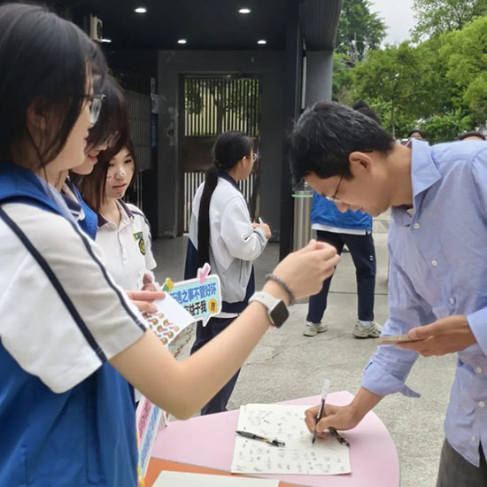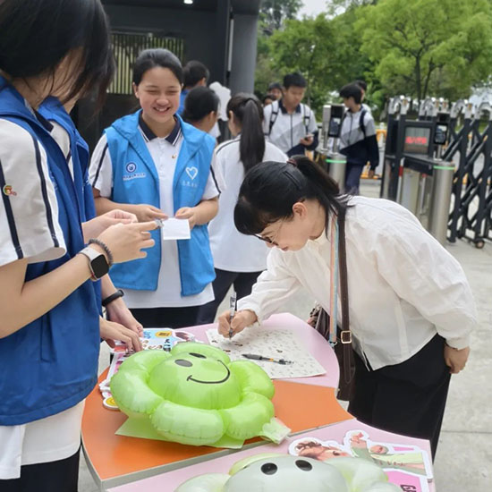 這個系列活動堪稱“快樂制造機”!微笑日當天,校門口變身超暖“能量補給站”——老師們戴著燦爛笑容,手持“棒棒大拇指”貼紙在校門口迎接每一位同學,貼上貼紙的瞬間,鼓勵與溫暖“一鍵送達”。大家還紛紛在特制橫幅上簽字,用畫筆勾勒出獨一無二的笑臉,原本普普通通的橫幅,不一會兒就被色彩斑斕的笑臉填滿,整個校園都洋溢著歡樂的氛圍!