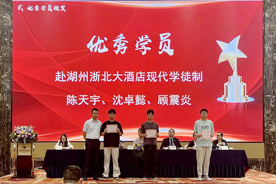 湖州賓館、浙北大酒店、湖州東吳開(kāi)元名都酒店領(lǐng)導(dǎo)為十位優(yōu)秀學(xué)員頒發(fā)榮譽(yù)證書(shū)。費(fèi)永軍副校長(zhǎng)為6位優(yōu)秀企業(yè)導(dǎo)師頒發(fā)榮譽(yù)證書(shū);優(yōu)秀學(xué)員代表2219班汪義超同學(xué)作學(xué)徒分享;學(xué)校綜合專(zhuān)業(yè)部副部長(zhǎng)孫葉玲,就本次現(xiàn)代學(xué)徒制的教學(xué)實(shí)施與考核評(píng)估作專(zhuān)業(yè)總結(jié)。