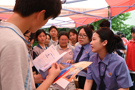 講座結(jié)束后,活動進(jìn)入互動實踐環(huán)節(jié)。區(qū)檢察院、區(qū)教育局、區(qū)公安分局等政法系統(tǒng)職能部門設(shè)立多個普法宣傳點位,為同學(xué)們提供全方位的法治教育。區(qū)檢察院工作人員耐心解答同學(xué)們在未成年人保護(hù)方面的法律困惑;區(qū)教育局老師圍繞校園安全與教育法規(guī),引導(dǎo)學(xué)生樹立正確的學(xué)習(xí)生活觀念;區(qū)公安分局民警通過展示反詐、禁毒宣傳展板、發(fā)放宣傳手冊等方式,進(jìn)一步強化同學(xué)們的法治認(rèn)知。現(xiàn)場同學(xué)們熱情高漲,紛紛圍在各點位前,認(rèn)真觀看、仔細(xì)閱讀、踴躍提問,工作人員也一一給予細(xì)致解答,互動氛圍熱烈非凡。