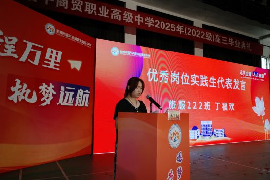 商助221班許樂明同學(xué)和旅服222班丁福歡同學(xué),分別作為優(yōu)秀畢業(yè)生和優(yōu)秀崗位實(shí)踐生代表上臺(tái)發(fā)言。短短幾分鐘,道不盡老師們?nèi)陙砼谴髟碌呐惆椋啦槐M失意時(shí)做他們情緒的垃圾桶,開心時(shí)背后默默的守候,道不盡這沉甸甸的青春。