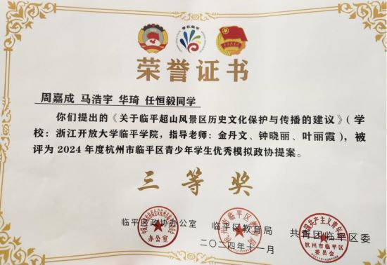 2024年校學生校外成長導師、區政協委員金丹文和思政教師鐘曉麗、葉麗霞,繼續指導學生參加模擬政協提案活動,通過深入調研,提出提案《關于臨平超山風景區歷史文化保護與傳播的建議》,對當前超山風景區歷史文化保護與傳播方面存在的問題提出了一些具體可操作的建議,提案最終獲得區級三等獎。