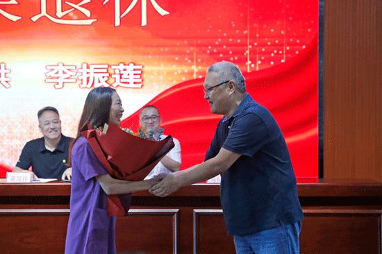 隨后,德清縣教育局黨委委員、德清縣職業教育黨委書記潘強為榮休教師送上了鮮花,以此表達對他們多年來辛勤工作和無私奉獻的感激之情。全場教職工以熱烈的掌聲,共同祝愿兩位教師退休生活幸福美滿。