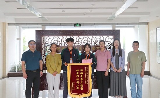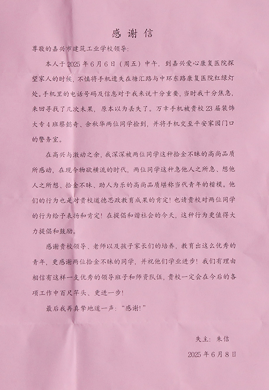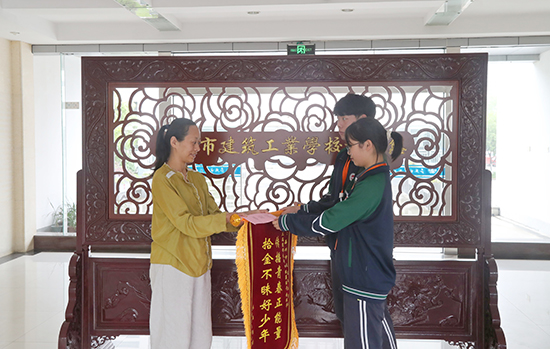 6月11日,南湖街道社工師朱佶女士專程來到嘉興市建筑工業學校,將一面錦旗和一封感謝信贈予蔡懿奇、余秋華兩位同學,表彰他們拾金不昧的善舉。