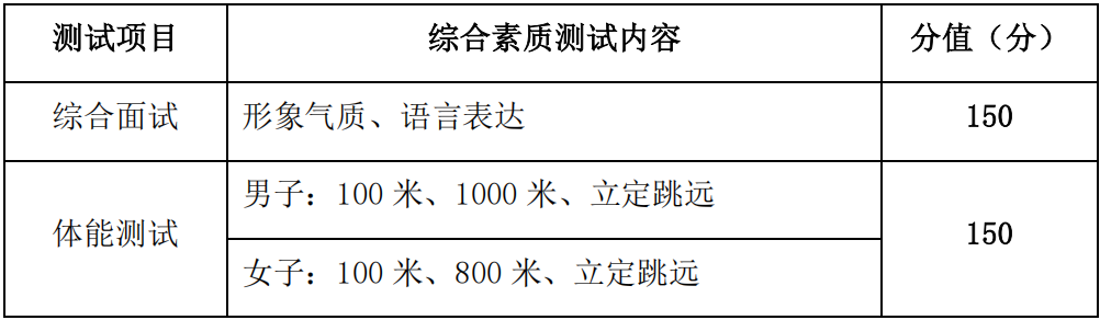 (一)綜合素質(zhì)測試流程為先綜合面試,后體能測試。綜合面試、體能測試均設(shè)置合格分,達(dá)不到合格分的予以淘汰。