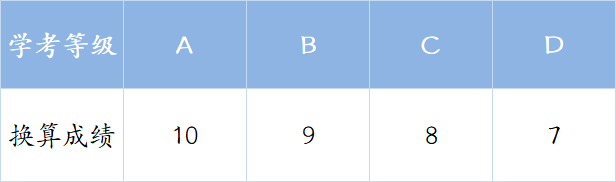 高中學考成績折合分由語文、數學、外語、政治、物理、歷史、化學、生物學、地理、技術10門科目等級換算而成,往屆生的技術學考折算成績取通用技術折算成績與信息技術折算成績之和的平均值。換算關系如下表: