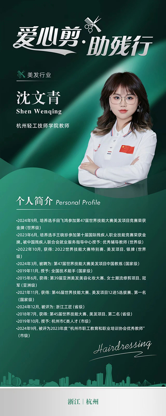 拱墅區(qū)“愛心剪·助殘行”公益活動現(xiàn)場,杭州輕工技師學(xué)院教師沈文青俯身與輪椅上的王阿姨輕聲交流,手中剪刀精準落下。這位曾站上世界技能大賽領(lǐng)獎臺的95后姑娘,此刻正將她的頂尖技藝化作助殘暖流。