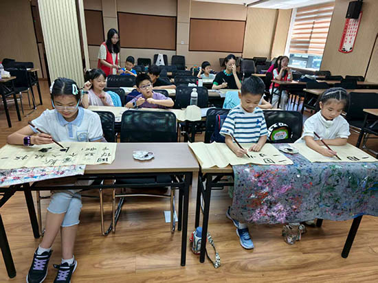 書法課程作為夏令營的“每日必修課”,由專業書法老師帶領孩子們從執筆姿勢到基本筆畫逐步練習。結營儀式上,孩子們紛紛展示自己五日來的墨寶,一筆一畫間盡顯專注與成長。此外,非遺手工藍曬與陶泥藝術課程也備受青睞。孩子們用藍曬技法將樹葉、花朵定格成“自然藝術品”,用陶泥捏出“迷你故宮”“小動物家族”,在動手實踐中感受傳統工藝的魅力。