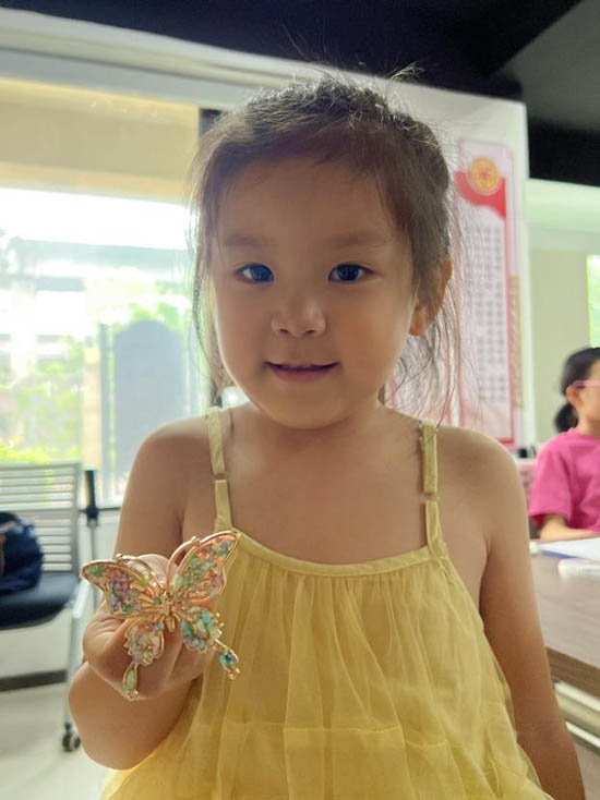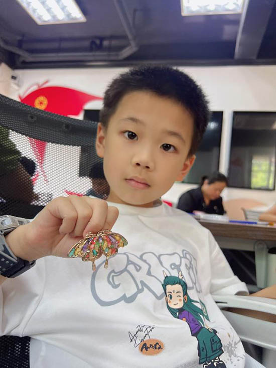 短短一小時(shí)很快過(guò)去,孩子們都順利完成了作品。陽(yáng)光下,蝴蝶胸針的翅膀折射出細(xì)碎的光,牡丹胸針的花瓣層層疊疊,每一件都精致又可愛(ài)。孩子們舉著自己的成果,臉上滿是自豪的笑容,還互相“炫耀”著彼此的作品。