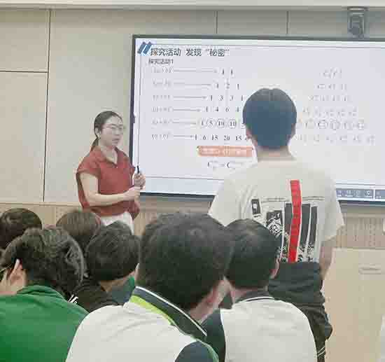 朱培培老師則呈現了一堂以中華數學瑰寶為脈絡、思想方法深度交融的文化浸潤式課堂。她以《九章算術》開方術為歷史原點,溯源二項式定理的誕生密碼,引導學生重走古人“從開方需求到展開智慧”的探索之路;借楊輝三角為文化橋梁,在填表作圖中貫通代數規律與幾何直觀,使學生親歷“形助數推、數形相生”的思維升華;更以賦值法為思想樞紐,在例題演繹中揭示二項式系數的函數本質,實現數學史、方法論與核心素養的立體融通。