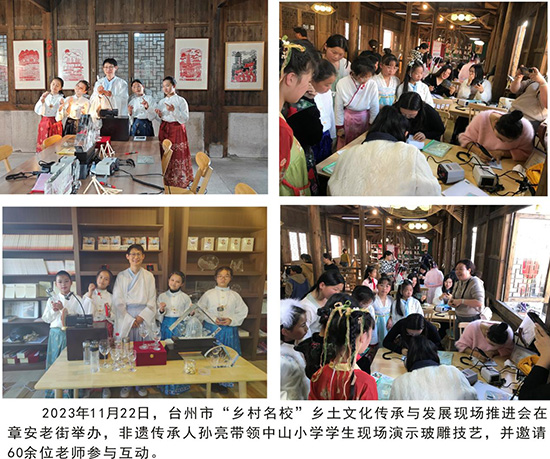 二是“玻璃文化”書院在學(xué)院路小學(xué)、文淵小學(xué)、華師大臺州學(xué)校、椒江二職、職業(yè)中專、臺州職業(yè)技術(shù)學(xué)院等學(xué)校創(chuàng)建了非遺社團,每周一到二次社團活動,體驗高超的民間藝術(shù)文化,提高學(xué)生對藝術(shù)品的鑒賞能力,培養(yǎng)學(xué)生熱愛家鄉(xiāng)文化的情感。