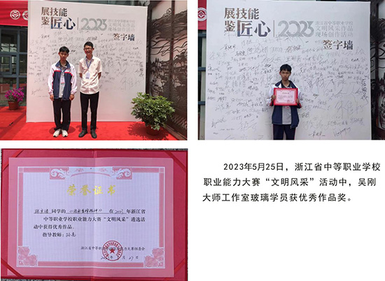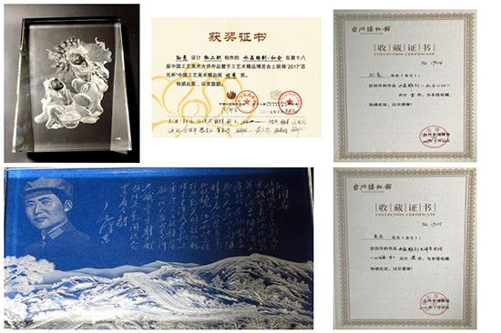 多年來,吳子熊玻璃藝術(shù)館內(nèi)收藏了大量的玻璃文化藝術(shù)精品,具有極高的文化內(nèi)涵。這里有兩大“大世界吉尼斯之最”——玻璃雕刻各國元首肖像數(shù)量之最、最大的玻璃報紙《天津日報》;有以凸浮雕的技藝雕刻在二塊巨大的玻璃上的、吳邦國委員長贈送吳子熊的《黃鶴樓》唐詩一首;有國內(nèi)最大的的《水晶象棋》,每顆重約5公斤;有獲上海大世界吉尼斯記錄、世界唯一的玻璃報紙《開國大典》;有玻璃彩色浮雕《勇立潮頭》;有典雅飄逸、吳帶頭風(fēng)、儀態(tài)大方、氣宇非凡的《87神仙卷》;有《長征》大型玻璃雕刻書法;有《中國奧運冠軍》大型玻璃雕刻藝術(shù)品等,是臺州一張閃亮的城市名片。吳剛大師被浙江省總工會授予“浙江工匠”榮譽稱號,被臺州市椒江區(qū)總工會聘為椒江工匠學(xué)院特聘講師;書院主要成員孫亮老師被臺州椒江區(qū)總工會授予“椒江工匠”榮譽稱號。書院學(xué)員在省級刊物發(fā)表論文16篇,27件作品獲省級 及全國金獎和銀獎,有力地提高了品牌的知名度。