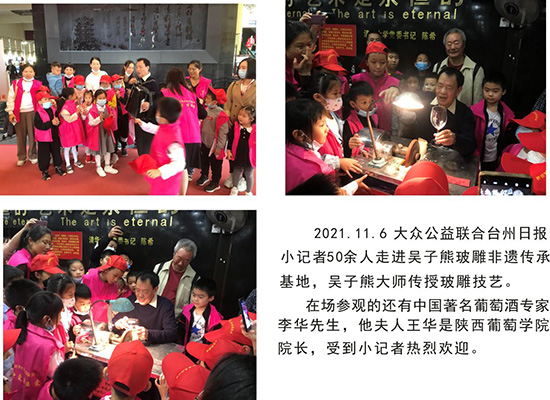 “玻雕文化”書院積極參與全民終身學(xué)習(xí)體系的構(gòu)建,由葭沚成校牽頭,以“玻雕文化”書院為載體,采取非物質(zhì)文化遺產(chǎn)的傳承與社會服務(wù)相結(jié)合的方式,服務(wù)全民終身學(xué)習(xí),到各個社區(qū)、文化禮堂、企業(yè)等進行非遺展示,讓群眾參與非遺體驗,讓非物質(zhì)文化為城市、為市民的生活添加色彩,傳承中華民族傳統(tǒng)技藝和豐富居民精神生活、提升居民文化自信的雙重價值,培養(yǎng)大國工匠精神,也為建設(shè)祖國的美好未來貢獻力量,2023年“玻雕文化”書院獲評臺州市全民終身學(xué)習(xí)品牌項目。書院自成立以來,社會影響力不斷擴大,各類各級媒體多次報道“玻雕文化”書院在全民終身學(xué)習(xí)中做的有益的嘗試,2023年4月21 日中央電視總臺在葭沚老街舉辦“推動共同富裕浙江研討會暨媒體行動”直播報道,“玻雕文化”書院負責(zé)人孫亮以非“遺潤童心,文化共傳承”為主題,在報道中宣傳介紹“玻雕文化”。習(xí)近平總書記任浙江省委書記時視察藝術(shù)館時多次談到,“這個藝術(shù)館辦得很好,很有自己的特色,希望你們一定要把技藝傳承下去,一代比一代更好”。國務(wù)院總理李強同志,全國人大常委會委員長趙樂際同志,中央政治局常委蔡奇同志,中央政治常委陳希同志,中央政治局委員陳敏爾同志,中央政治局委員黃坤明同志,原全國人大常委會委員長張德江同志,原全國政協(xié)主席賈慶林同志先后視察藝術(shù)館,他們有的留詞、題字和講話及合影。鞭策鼓勵吳氏的玻璃雕刻技藝,他們的鼓勵給了我們力量和信心,也是給我們中華民族的文化注入了自信與活力。玻璃雕刻藝術(shù)品曾作為“ 國禮 ”贈送墨西哥總統(tǒng)卡爾德龍、法國前總統(tǒng)希拉克、美國前總統(tǒng)老布什、克林頓、加拿大總理、聯(lián)合國前秘書長安南、潘基文等,并得到他們的回信及高度評價,“玻雕文化”走向了世界。