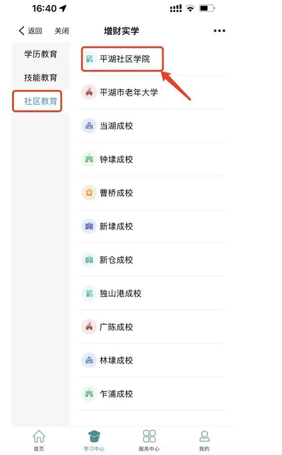 3、進入平臺學習中心,并選擇“平湖社區學院”及對應的課程