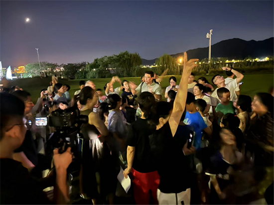 當夜幕低垂,活動將進入最令人期待的天文觀測環節,居民們滿懷期待地移步浦沿漁碼頭廣場旁網紅大草坪,一場沉浸式天文觀測活動正式開啟。此時月光皎潔,鄒小斌老師與志愿者們早已架設好專業天文望遠鏡,等候大家的到來。