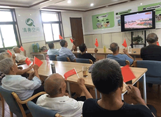 上午9點不到,樂齡教室內已是歡聲笑語,老人們手舞小紅旗,胸貼小五星,眼晴緊瞪著電視屏幕,生怕錯過每一個細節。