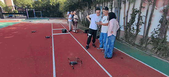 理論培訓結束后,學員分組開展實操練習。五人一小組各由一名經驗豐富的航拍員帶隊,于學校操場進行實地試飛操作。