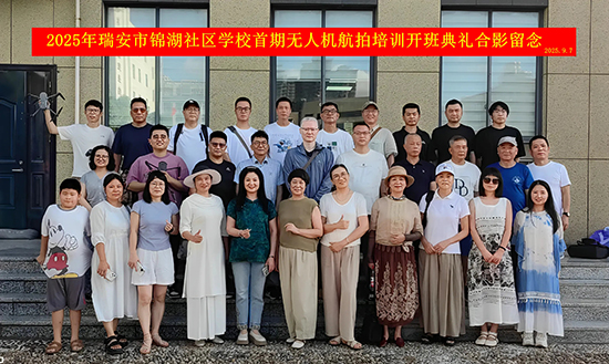 9月8日下午,瑞安市錦湖社區學校文化禮堂內氣氛熱烈,2025年首期“無人機航拍培訓”開班典禮在此成功舉行,吸引近40名無人機航拍愛好者踴躍參與。本次活動由瑞安市錦湖社區學校教師、無人機應用協會副會長徐京崗主持。