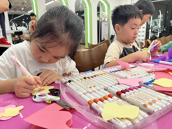 “小朋友們,試著和爸爸媽媽分工,你選花瓣顏色,讓爸爸媽媽幫你扶著剪刀好不好?”虞老師以引導(dǎo)式提問開啟課堂,巧妙化解部分家長“代勞式幫忙”的誤區(qū)。講解制作步驟時,她不僅示范裁剪、粘貼的技巧,更注重引導(dǎo)親子觀察彼此的動作、傾聽對方的想法——有的孩子堅持要給花瓣粘上“星星裝飾”,家長從最初的“覺得麻煩”轉(zhuǎn)變?yōu)槟托呐浜稀Un堂上,膠水粘到指尖的小插曲、花瓣位置擺放的小討論、完成作品時的歡呼聲,交織成最溫暖的家庭互動圖景。