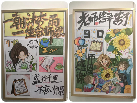 師生餐廳樓梯墻面裝飾了由同學們親手繪制的祝福卡片。一張張卡片色彩鮮明、筆觸真摯,無聲傳遞著莘莘學子對老師的深厚情誼。活動期間,許多教師駐足細看,在圖文之間感受來自學生的真誠祝福。