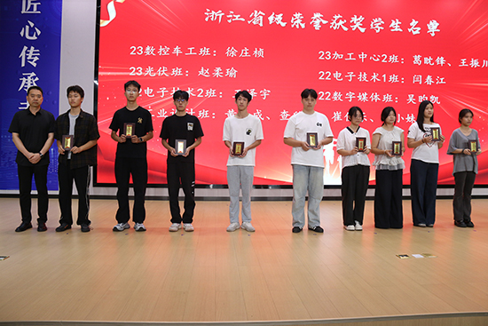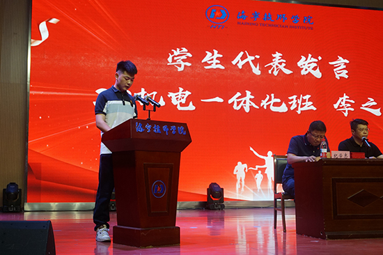 學生代表22級機電一體化專業李之源同學——全國大學生先進成圖技術與產品信息建模創新大賽一等獎獲得者,分享了他的技能成長經歷,并倡議同學們以“問題導向”思維、“終身學習”能力和“沈鴻精神”為指引,在技能報國的道路上書寫精彩人生。