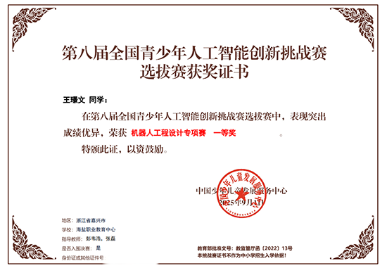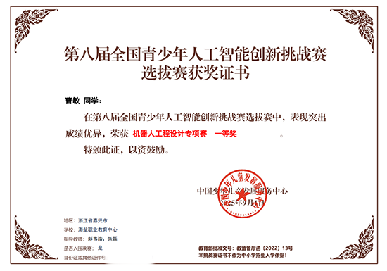 在繼全國青少年人工智能創新挑戰賽市賽中創下佳績后,海鹽職業教育中心人工智能參賽隊再傳捷報。近日,在第八屆全國青少年人工智能創新挑戰賽華東大區賽中,該校四位選手憑借扎實的技術功底、穩定的發揮和優異的綜合表現,從眾多優秀選手中脫穎而出,全員問鼎。其中三位選手斬獲了進軍全國總決賽的寶貴資格。