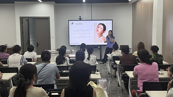 課程伊始,楊老師通過多媒體課件系統性地講解了化妝的步驟,帶領大家一樣樣解開化妝包的“秘密武器”。從各類刷子的功能到每一樣化妝品的功能,每一個細節都講解得細致入微。在實操演示環節,老師邀請學員作為模特,現場演示如何打造輕薄透亮的底妝。“妝前保濕要做好,防曬隔離不可少,粉底要少量多次地上,定妝要輕薄均勻……”老師一邊操作一邊講解,學員們或認真記錄,或舉起手機拍攝,唯恐錯過任何一個細節。