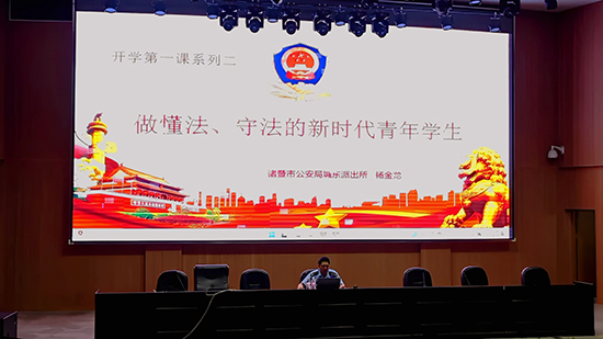 新學期伊始,為進一步增強學生的安全防范意識和法治觀念,諸暨市公安局城東派出所楊金龍警官作為諸暨技師學院法治副校長,為全體學生開展專題講座。講座圍繞“預防電信詐騙”和“普及法律常識”兩大主題展開,以鮮活的案例、詳實的講解,為同學們帶來了一場內容充實、警示深刻的法治教育課。