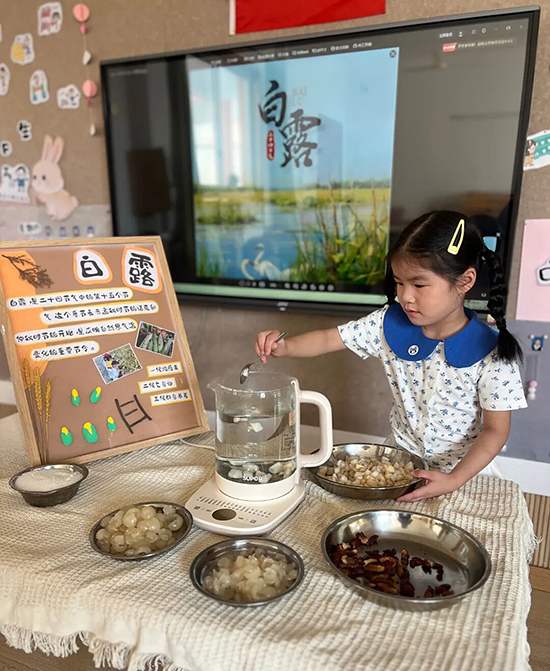 品白露。白露節氣,泡上一壺“白露茶”也是一件愜意的事。白露時節采摘的茶葉,民間有“春茶苦,夏茶澀,要喝茶,秋白露”的說法,白露茶既不像春茶那樣鮮嫩,不經泡,也不像夏茶那樣干澀味苦,它多了一些過火的味道,給人的感覺剛剛好。幼兒們切成梨丁、放上茶葉、添入桂圓、棗片在茶壺中煮,輕輕呷一口,唇齒之間滿是甘醇的味道。