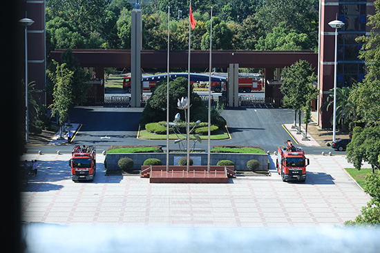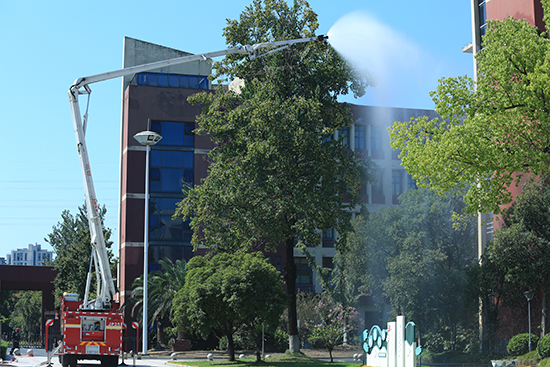 廣場上,消防隊員們還展示了消防作業車及登高救援設備,這些平時難得一見的“消防利器”吸引了眾多師生的目光。消防隊員們一邊進行現場講解,一邊熟練地操作設備進行演示。他們詳細介紹了消防作業車的功能和使用方法,以及登高救援設備在高層建筑救援中的重要作用。通過這種現場講解與演示,同學們對消防救援裝備有了更直觀、更深入的認識,仿佛打開了一扇通往消防世界的大門。這不僅增強了消防安全知識的實踐性,也讓同學們深刻感受到了消防工作的艱辛和偉大。