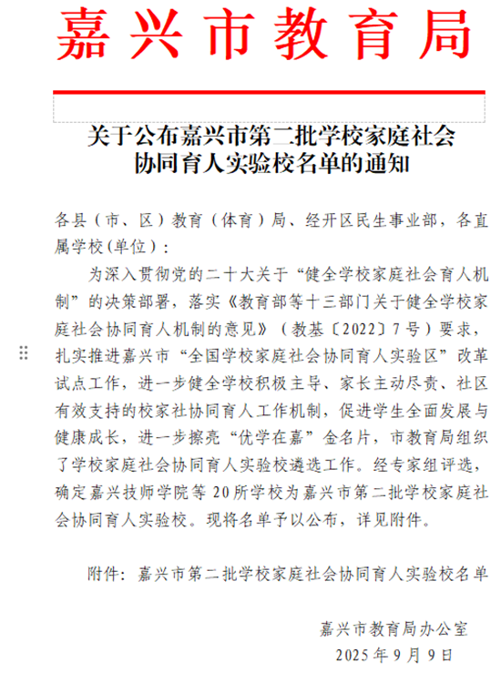 近日,嘉興市教育局公布第二批學校家庭社會協同育人實驗校名單,嘉善信息技術工程學校《探索“四共建二融合一橋梁” 家校社協同育人新生態:陽光成長指導中心賦能學生全面發展》的優秀實踐案例成功入選。