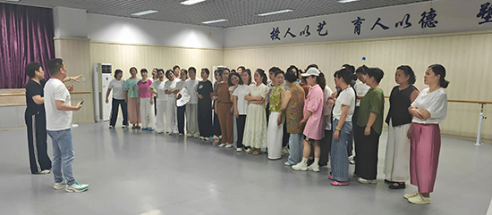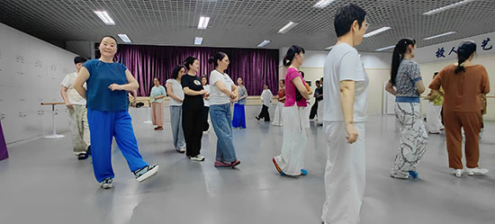 簡(jiǎn)短而莊重的開班儀式結(jié)束后,兩位老師便馬不停蹄地投入到了緊張而有序的教學(xué)中。她們首先帶領(lǐng)學(xué)員進(jìn)行熱身走步,過程中,兩位老師耐心細(xì)致,不放過任何一個(gè)細(xì)節(jié),親自示范步法與手勢(shì),讓學(xué)員們能夠準(zhǔn)確掌握每一個(gè)動(dòng)作要領(lǐng)。隨后,根據(jù)學(xué)員的特點(diǎn)和自身優(yōu)勢(shì),將學(xué)員們巧妙地分為花旦和小生組,進(jìn)行有針對(duì)性的教學(xué)。在兩位老師的悉心指導(dǎo)下,學(xué)員們迅速進(jìn)入狀態(tài),全神貫注地認(rèn)真練習(xí),現(xiàn)場(chǎng)學(xué)習(xí)氛圍濃厚。不一會(huì)兒,學(xué)員們便轉(zhuǎn)入了越劇經(jīng)典劇目《打金枝·闖宮》的排練中。大家各展風(fēng)采,將越劇的韻味展現(xiàn)得淋漓盡致,現(xiàn)場(chǎng)氣氛熱烈而有序,仿佛一場(chǎng)精彩的越劇盛宴正在徐徐拉開帷幕。