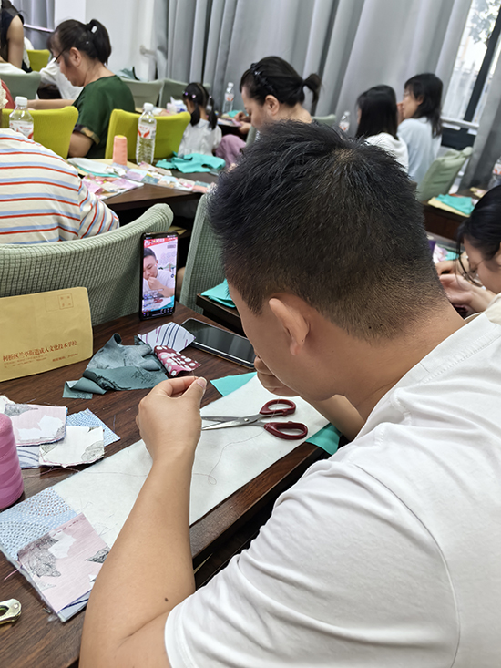 活動中,一位男學員成為焦點。他不僅以出色的動手能力快速掌握了制作技巧,還創(chuàng)新性地通過手機直播,實時分享制作步驟和心得,將現(xiàn)場火熱的學習場景和拼布技藝的獨特魅力傳遞給線上觀眾,引發(fā)現(xiàn)場陣陣歡笑和點贊,充分展現(xiàn)了新時代技能學員的風采。