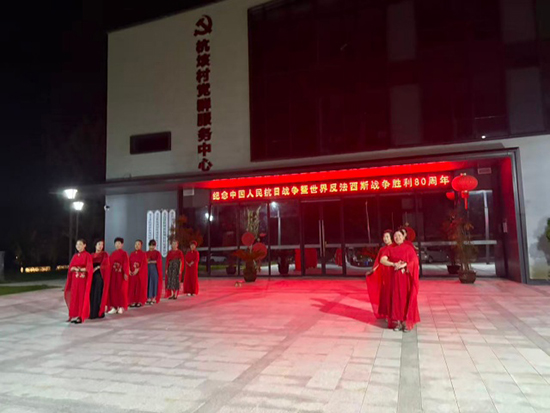 杭垓村村委廣場燈火通明,氣氛熱烈。近20位形體班成員,在指導(dǎo)老師章蕓的悉心指導(dǎo)下,伴隨著激昂奮進(jìn)的曲目《共和國走向未來》,進(jìn)行了精彩的走秀排練表演。學(xué)員們步伐穩(wěn)健,儀態(tài)大方,一襲紅裙在夜色中格外耀眼,象征著對共和國的熾熱情懷和對未來的美好憧憬。她們用形體語言演繹了共和國發(fā)展的壯闊歷程,展現(xiàn)了新時代農(nóng)村居民積極向上、追求美好生活的精神風(fēng)貌。