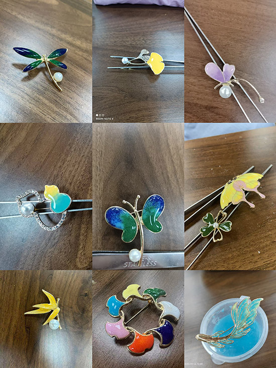 課堂伊始,社區活動室內已是金絲閃爍、彩釉流轉,一場指尖上的傳統工藝初體驗悄然開啟。徐夢曉老師從掐絲琺瑯的淵源歷史講起,逐步分解制作步驟,通過細致講解幫助學員輕松邁入琺瑯世界。實操環節,大家手持專用小勺,一絲不茍地繪制圖稿、精細掐絲細心填彩,翠綠為葉,鵝黃作瓣,輕抖手腕控制釉料濃淡,換色前不忘擦拭工具,避免混色。隨著彩釉徐徐鋪展,素白銀胚漸漸生動,一件件獨一無二的琺瑯胸針在居民手中初見形態。燈光之下,釉色晶瑩流轉,韻味自成,大家看著自己親手完成的掐絲琺瑯作品,那份成就感與自豪感油然而生,大家紛紛舉起自己首次完成的琺瑯胸針相互展示。