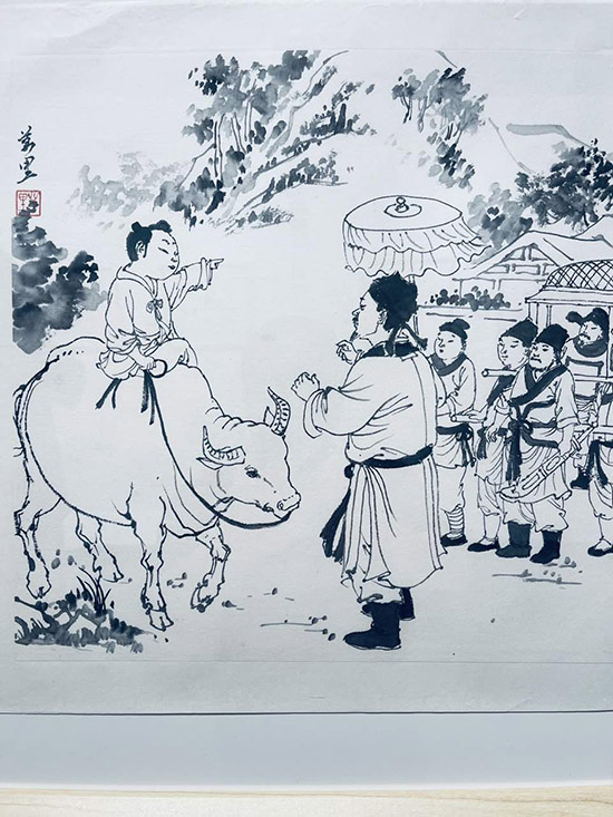 洪萬里以“楓橋三賢”——王冕、楊維楨、陳洪綬三位歷史人物為創作切入點,深得陳洪綬(號老蓮)遺風。其筆下的羅漢、八仙、達摩、和合二仙等人物畫,嫻熟運用陳洪綬所創“高古游絲描”,線條圓潤細勁、流暢連綿,如春蠶吐絲,盡顯古拙金石韻味。他以傳統筆法勾勒人物,形制高古奇駭,衣紋流轉自如,在傳承傳統白描精髓的同時,融入現代審美意趣,實現了古典題材與當代藝術精神的對話。畫作將地域名人故事與紅色文化娓娓道來,展現出深厚的文化底蘊與非凡的藝術創造力,既是對歷史的致敬,也是對人文精神的當代重構。