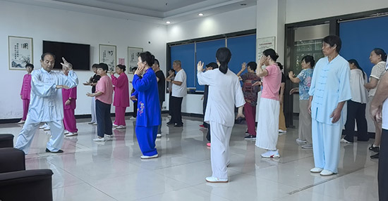 孫老師還引導學員領悟太極拳的精神境界,要求心無雜念、全神貫注,將意念融入動作,做到眼隨手走、神注于拳,仿佛與天地萬物融為一體。播放古典音樂后,學員們閉眼靜心感受呼吸與身體變化,再隨音樂節(jié)奏練習,動作愈發(fā)柔和流暢,眼神透著寧靜專注。