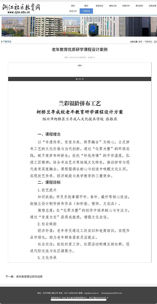 近日,蘭亭成校校長張銀燕主持撰寫的《<蘭彩銀齡拼布工藝>柯橋區蘭亭成校老年教育課程設計方案》獲評浙江省老年教育優質研學課程設計方案,成為全區唯一入選項目。這一榮譽的背后,是學校自2022年9月以來對拼布工藝培訓的持續深耕與創新探索。