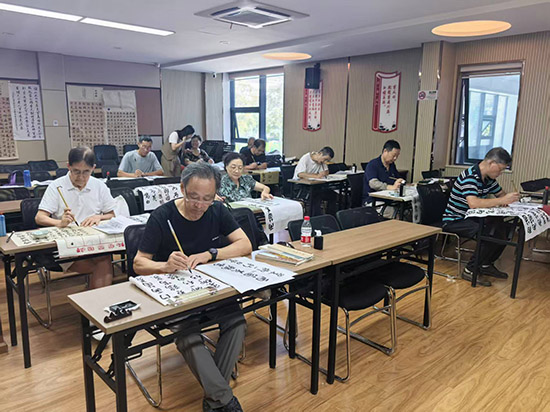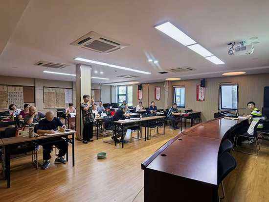 走進各個教室,墨香、歌聲與歡聲笑語交織。書法課上尤為熱鬧,畢老師先笑著肯定了學員們的進步:“大家之前的學習沒白費,進步肉眼可見!”隨后,他結合學員們的《洛神賦》作品展開細致點評,從墨色濃淡的層次感、字體收放的節奏感,到字與字間大小、疏密的對比關系,逐一進行點評講解。學員們圍在一旁認真傾聽,不時點頭記錄,遇到疑問及時提問,畢老師都耐心一一解答。點評結束后,畢老師拿起毛筆開始現場示范,從起筆的輕重、行筆的快慢到收筆的頓挫,每一個動作都講解得清晰到位。學員們緊隨其后握筆臨摹,教室里瞬間安靜下來,只聽見筆尖劃過宣紙的沙沙聲。大家目不轉睛盯著字帖,一筆一劃認真專注,遇到拿捏不準的地方,便抬頭看看老師的示范,或是輕聲向身邊同學請教,沉浸在書法學習的樂趣中。