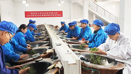 “一人富不是真的富,大家富才是真的富!”這是宋昌美時刻掛在嘴邊的一句話。2001年4月,宋昌美牽頭成立了溪龍鄉(xiāng)女子茶葉合作社,合作社由最初的8戶茶農(nóng),發(fā)展到40多戶,直至如今的200多戶女性茶農(nóng)。合作社定期開展手工制茶比賽,傳承安吉白茶制作技藝,舉辦專業(yè)培訓,培養(yǎng)茶產(chǎn)業(yè)專業(yè)人員,截止目前,合作社已培養(yǎng)高級評茶員、茶藝師、茶葉加工工共502人。同時,合作社建立平臺,將生產(chǎn)技術(shù)攻關(guān)、新技術(shù)的應(yīng)用以及新產(chǎn)品研發(fā)和技能人才培養(yǎng)等進行有機結(jié)合,通過課堂培訓、實地教學等方式示范推廣。為方便合作社成員學習,她投資興建的白茶服務(wù)中心綜合大樓中,專門開辟了可容納100余人學習的遠程教育播放室。截止目前,合作社已開辦茶園管理講座80余場,全鄉(xiāng)有50%的茶農(nóng),約2000人參與了安吉白茶種植學習。在她的帶動下,茶產(chǎn)業(yè)解決了本地和周邊鄉(xiāng)鎮(zhèn)3萬多人次的季節(jié)性就業(yè)問題。全鄉(xiāng)人均收入由6年前的1000多元上升到了1萬多元。