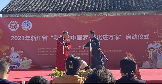 干一行,就要專一行。為提升自己的道情演唱技藝水平,他除了向師父虛心學習外,還多次參加省市組織的曲藝培訓班提升自己。他花費心思將金華市各縣市道情老藝人的道情演唱錄成音頻放在車里聽,隨時隨地吸收別人的表演技法。2023年,他打聽到東陽巍山鎮三村有一個道情老藝人呂一方,專程趕到他家拜訪,虛心求教。他孜孜以求的態度感動了老藝人,老藝人毫不保留地將現場演唱的傳統老曲本道情傳授與他。持續兩個多月,他往返奔波,完成了足足100多小時的傳統老曲本演唱視頻記錄,廢寢忘食地反復揣摩,積累了寶貴的道情文化資源,積蓄了爐火純青的表演技藝。