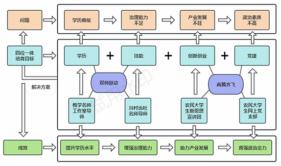 (一)提出“四位一體”模式,明確領雁培育目標。“領雁工程”采取全域教育理念,以促進人的全面、多維協調發(fā)展為導向,創(chuàng)新了“黨建引領+學歷教育+技能提升+創(chuàng)新創(chuàng)業(yè)”的“四位一體”鄉(xiāng)村人才“螺旋式”培養(yǎng)模式,探索出了“導師幫帶,線上與線下、理論與實踐、課堂與課外相結合”的“一導三結合”教學模式,構筑起個性、多元、開放、人本的協同育人新體系。