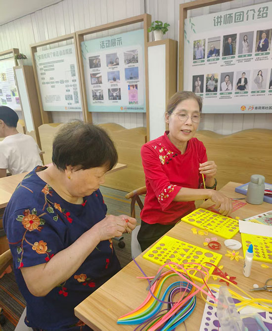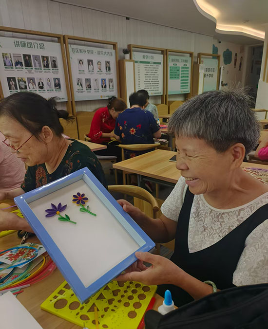 青荷苑社區曉荷書房里的盤衍紙課堂上,氣氛同樣熱烈。上城區社區好老師葉莉囡老師細致講解著盤衍紙的卷曲、粘貼技巧,展示著精致的成品。老人們小心翼翼地拿著衍紙筆,將彩色紙條卷成一個個基礎部件,再組合粘貼成花朵造型。“這活兒看著簡單,實則要細心,做好了特別有成就感!”邵阿姨舉著剛完成的衍紙作品,興奮地向同伴展示,指尖的溫度讓彩色紙條綻放出別樣光彩。