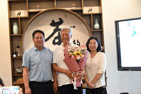 學院邵曉舟書記向潘會基老師獻上鮮花,祝愿潘老師在支教崗位上工作順利、桃李芬芳,并祝全體退休教師國慶、中秋雙節快樂。