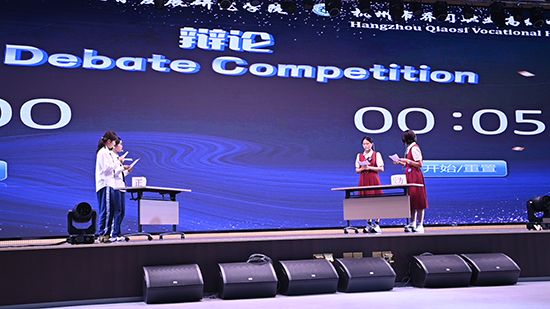 學生技能比賽先通過“聽力+閱讀”筆試,隨后,進行職業情景表演和辯論賽。選手在抽取題目后10分鐘準備,然后在90—120秒內完成情境表演。同樣的,辯論賽選手準備后,在4分鐘內正方反方展開激烈辯論。選手們反應敏捷、表達流暢,用英語化解臨場挑戰,展現出扎實的語言功底和團隊協作力。