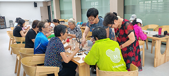 在專業(yè)手工老師的耐心指導(dǎo)下,居民們紛紛化身“設(shè)計(jì)師”,精心挑選自己心儀的圖案和布料。從最初的構(gòu)思設(shè)計(jì),到小心翼翼地剪裁布料,再到專注地縫合邊緣、粘貼固定,每一個(gè)步驟都凝聚著大家的巧思與耐心。現(xiàn)場(chǎng)氣氛熱烈而溫馨,大家互相交流制作技巧,分享配色心得,遇到困難時(shí)彼此幫助,完成作品時(shí)共同欣賞。方寸之間,指尖翻飛,原本零散的材料在居民們的巧手下,逐漸蛻變?yōu)橐幻睹丢?dú)一無二、充滿個(gè)人風(fēng)格的精致胸針。