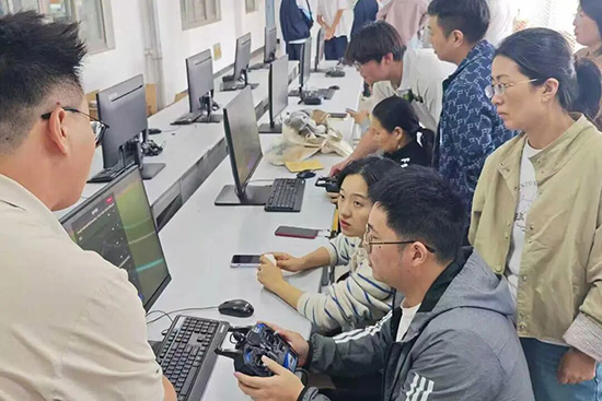 活動現場,學生們化身“準飛手”,在專業指導下先通過模擬飛行熟悉操控邏輯,再轉戰室內外實飛場地:室內練穩懸停精度,室外練飛行流暢度,還重點攻克了環繞目標、跟隨移動對象等實用飛行手法,不少同學眼神專注地操控搖桿,臉上滿是探索的熱情。另一邊,教師團隊則聚焦“能教善導”,從無人機零部件識別到整機拆裝,從常見故障排查到精準檢修,每一個步驟都反復實操演練,為后續課堂教學儲備扎實的實操經驗。