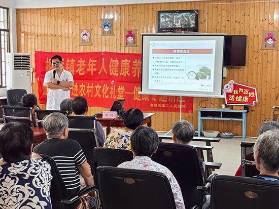 隨后,駱一舟開(kāi)講《中風(fēng)—高血壓》,用一組組數(shù)據(jù)敲響健康警鐘:“全球高血壓患者達(dá)15億,每年有700萬(wàn)人的死亡與高血壓相關(guān)”“我國(guó)25至34歲年輕男性高血壓患病率已高達(dá)20.4%”。這些數(shù)據(jù)讓以高血壓高發(fā)群體為主的老人們深感震撼,即便稍感疲憊,仍全神貫注地聆聽(tīng)。結(jié)合臨床案例,駱一舟系統(tǒng)講解了高血壓的嚴(yán)重后果、致病原因、與生活方式的關(guān)聯(lián)及防治原則。他指出,飲酒過(guò)量、缺乏運(yùn)動(dòng)、高鹽高糖高脂飲食等是誘發(fā)高血壓的主要因素,笑著調(diào)侃其為“富貴病”,引得老人們會(huì)心大笑,紛紛表示認(rèn)同。在預(yù)防與治療方面,他通過(guò)飲食圖片給出具體建議,倡導(dǎo)不吸煙、限飲酒、適量運(yùn)動(dòng)的健康生活方式,并強(qiáng)調(diào)高血壓患者需長(zhǎng)期堅(jiān)持改善生活習(xí)慣、定期監(jiān)測(cè)血壓,且必須接受規(guī)范化的藥物治療。講座在“祝大家身體健康”的誠(chéng)摯祝福中收尾。