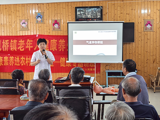 卓周平以《氣道異物梗阻》為題,圍繞“是什么、怎么認(rèn)、如何救、要牢記”四個(gè)維度展開(kāi)講解。她首先明確,氣道異物梗阻是指呼吸道任一部位被異物阻塞,導(dǎo)致呼吸不暢甚至中斷的危急情況,并細(xì)數(shù)了進(jìn)食說(shuō)話、腦部疾病等七種常見(jiàn)誘因。當(dāng)講到日常生活中頻發(fā)的“打嗝”等場(chǎng)景時(shí),臺(tái)下老人們看著圖文并茂的課件,紛紛點(diǎn)頭表示深有體會(huì)。為幫助老人規(guī)避風(fēng)險(xiǎn),卓周平特別列舉了高風(fēng)險(xiǎn)物品,食物類如果凍、整顆葡萄、帶骨肉類等,物品類如別針、硬幣等,提醒老人們照看孫輩時(shí)務(wù)必格外留意。她還清晰區(qū)分了“不完全梗阻”與“完全梗阻”的不同表現(xiàn),并現(xiàn)場(chǎng)演示了咳嗽自救、背部叩擊、腹部沖擊法(海姆立克法)及胸部按壓法四種處置手段。其中,對(duì)關(guān)鍵的海姆立克法,她邀請(qǐng)老人上臺(tái)配合示范,老人們踴躍參與,希望多掌握一項(xiàng)急救技能以備不時(shí)之需。最后,卓周平強(qiáng)調(diào),急救處理后仍需及時(shí)撥打“120”,交由專業(yè)醫(yī)護(hù)人員處置。
