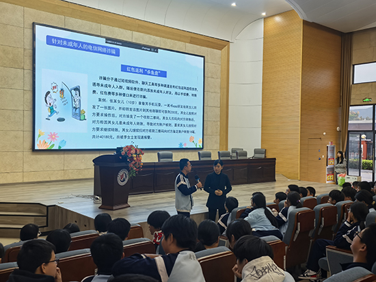 “青少年是國家的未來,必須學法、知法、懂法!”孟柳霞的開場直切主題。她先從憲法講起:“大家要先弄清憲法賦予的權利,比如勞動權、受教育權、休息權;也要牢記應盡的義務,像愛國、守法、服兵役,這些都是法治社會的基礎。”為了讓知識更易吸收,她現場拋出“我國的根本大法是( )”“專門保護未成年人的法律是( )”等問題,學生們紛紛舉手搶答,氣氛瞬間熱烈起來。隨后,孟柳霞重點強調了兩個“關鍵提醒”:一是明確十四至十六周歲青少年需承擔刑事責任的“故意殺人、強奸”等八個特定罪名,二是列出“營業性KTV、歌廳、酒吧”等未成年人不宜進入的場所,讓學生們清晰知曉“法律紅線”。在“防范電信詐騙”“遠離毒品危害”“拒絕校園欺凌”環節,她結合身邊真實案例,細致拆解風險點與防范方法,還通過一個個互動小問題引導學生主動思考,讓法治意識真正“入耳入心”。講座最后,孟柳霞以“珍惜自身成長,自覺遵守法律,才能避免走上違法犯罪的道路”收尾,為這場課畫上圓滿句號。“這樣的講座太有用了!不僅學到了法律知識,還明白該怎么保護自己,回答問題拿到的馬克杯也很有紀念意義!”802班的小駱拿著禮物,臉上滿是笑容。
