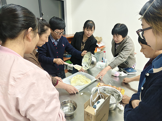 此次培訓是夏履成校“浙履講堂”的延伸實踐,聚焦村民“學技能、促增收”需求,邀請專業烘焙師授課。課堂上,老師從食材選購、面團揉制、發酵溫度控制到造型設計、烘烤技巧,進行手把手教學。從基礎的吐司、餐包到顏值與口感兼具的牛角包、蔓越莓軟歐包,學員們認真記錄配方要點,在老師指導下反復練習,禮堂內不時響起請教聲與歡笑聲。